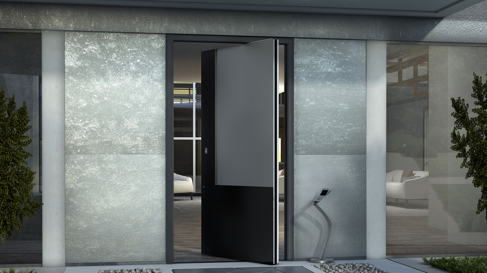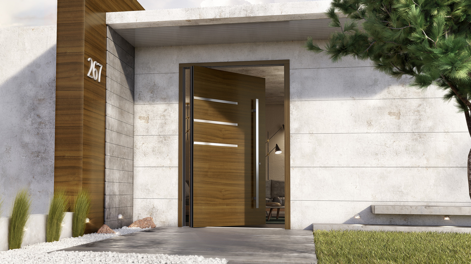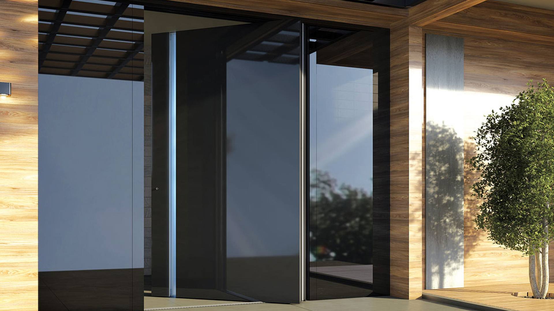 The Hybrid Core 77 / Semi Flat series is ideal for high specification axial main entrance doors for residential and commercial premises with emphasis on security and aesthetics. It enables the realization of constructions using bonded aluminium sheet metal and glass panes with slat, offering unparalleled aesthetics and high safety, thanks to the large dimensions that can be achieved.